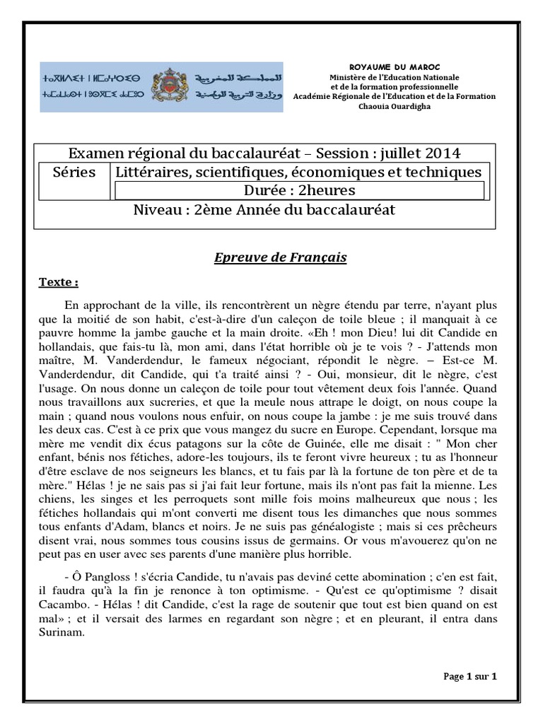 Examen Francais Regional Du Baccalaureat Pdf Candide